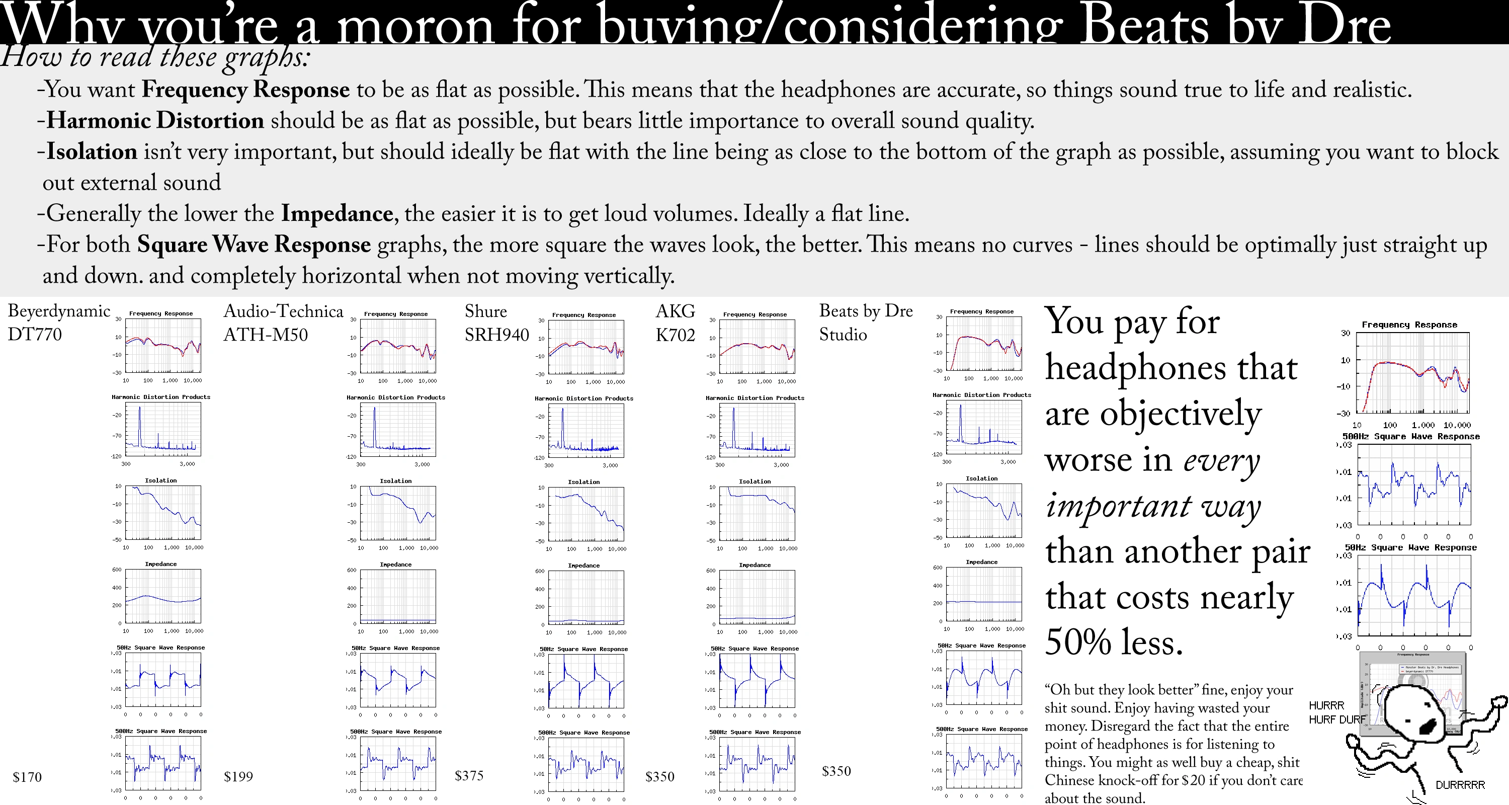 Remember: there are no objectively better in terms of sound. The "Small test on Dre Beats, Steer clear of them!" picture says: "You want Frequency Response to be as flat as possible." -- this is not necesarily true. Beyerdynamic's DT880 is considered detailed and neutral, yet it's not the most popular headphones. We can speak about how HifiMan's HE400 has very recessed mids, but whether that's a pro or cons is for yourself to find out. Then there's parts we can warn you about, such as build quality.